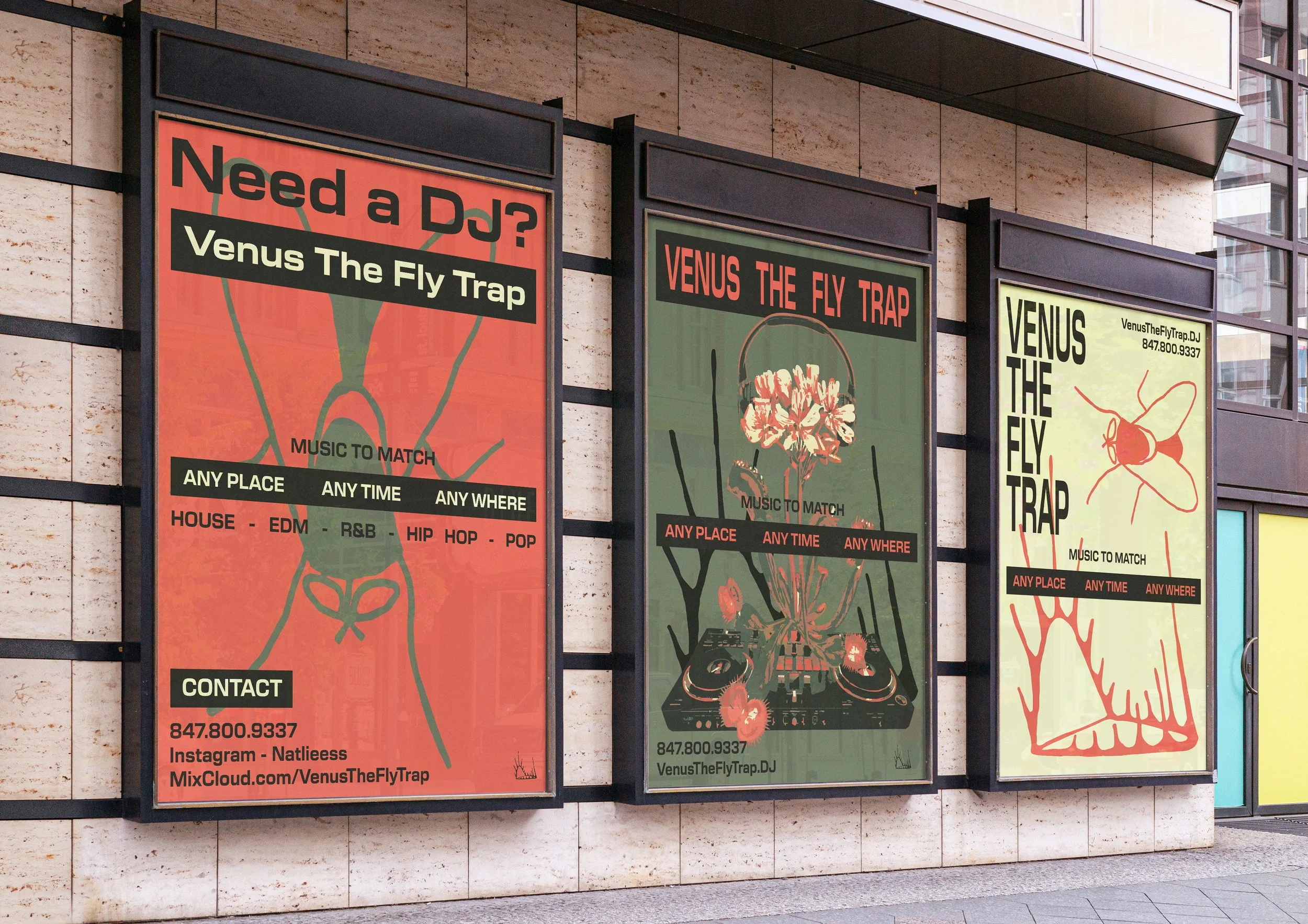 Branding for my DJ identity — Venus The Fly Trap — includes flyers, business cards, and merchandise.