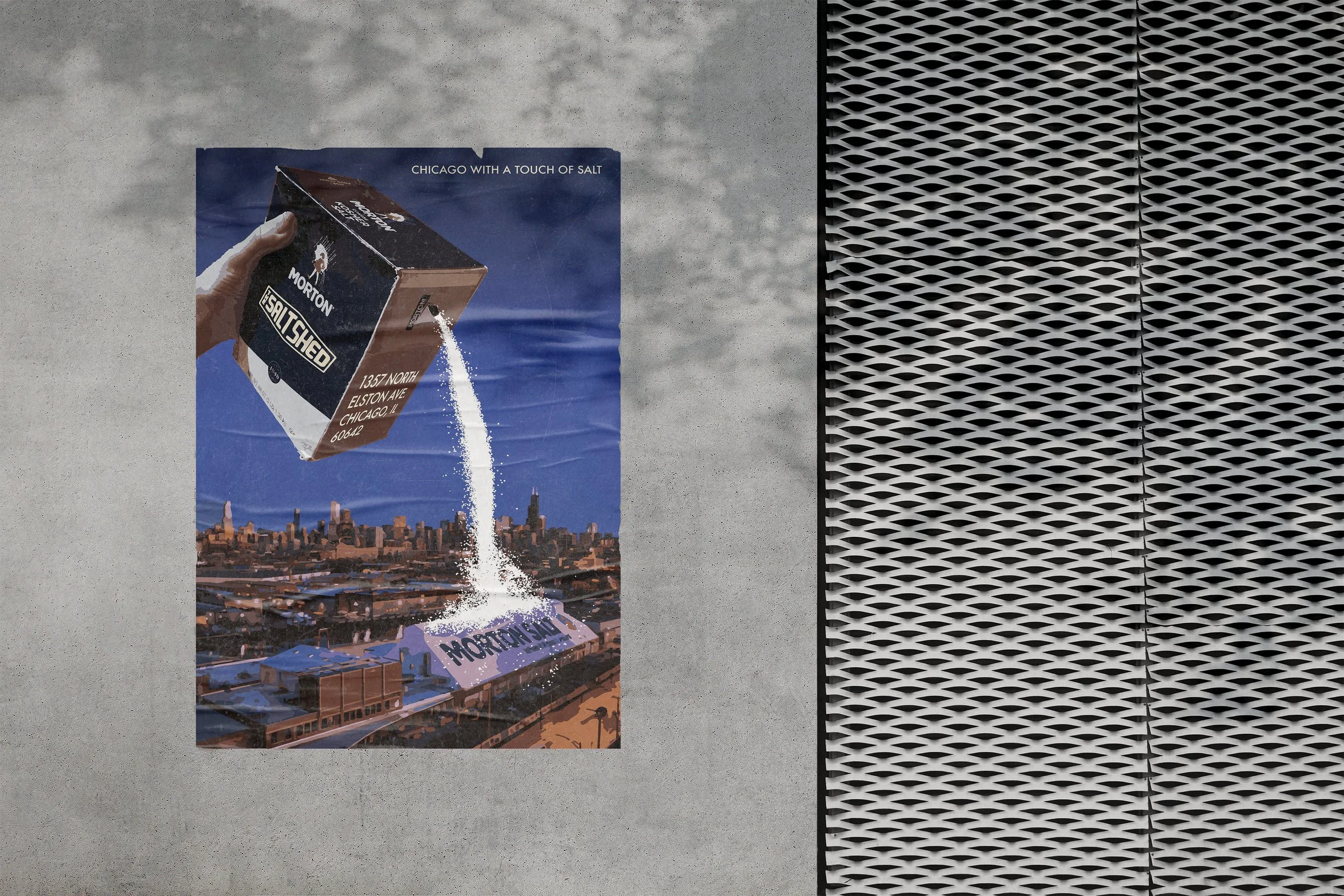 This Salt Shed poster was inspired by the Morton salt that was sitting on my kitchen counter. Creating this larger-than-life salt container gives an interesting perspective to the design. The pouring of the salt adds movement to the poster, making it feel alive.